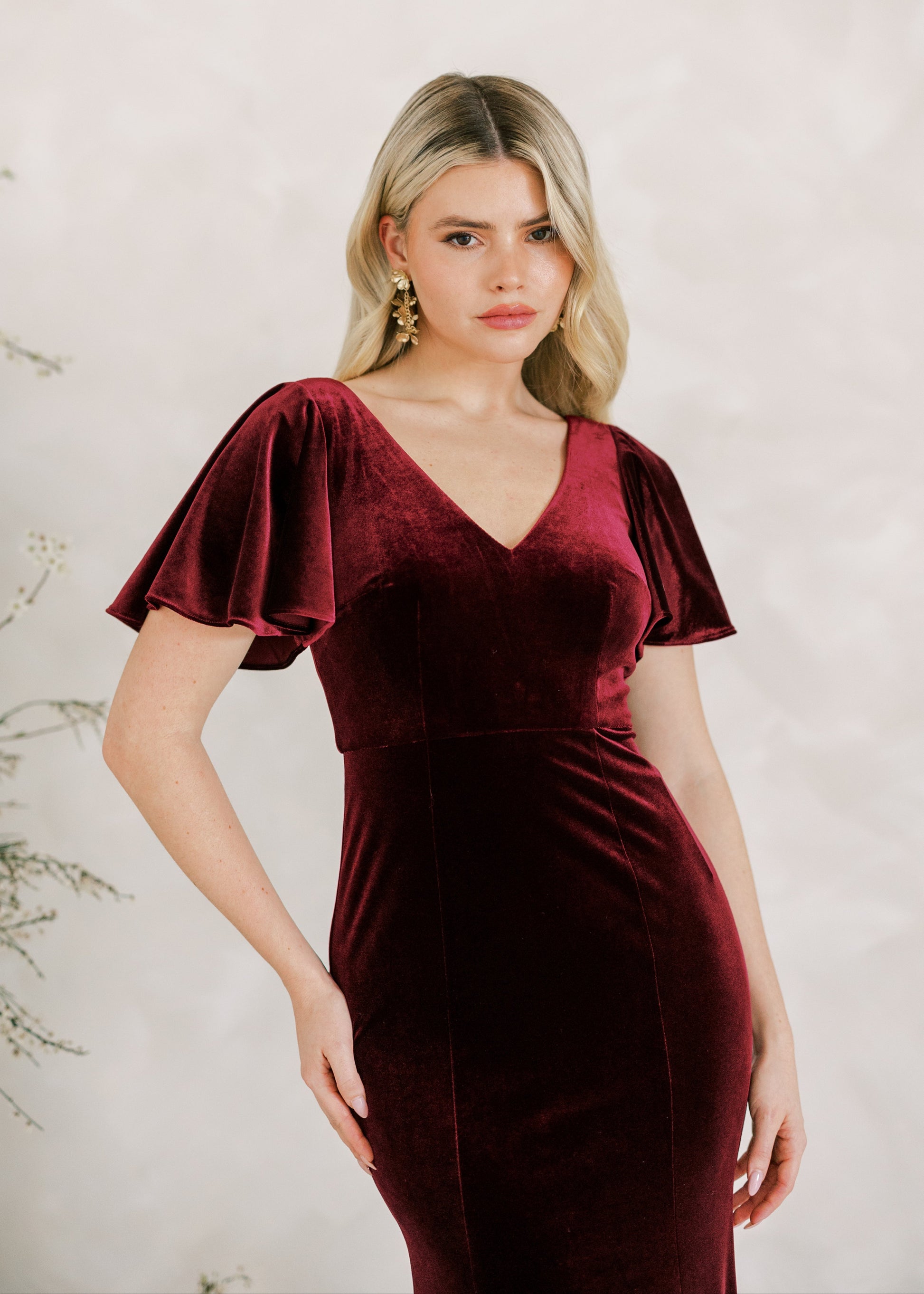 Made from sumptuous stretch velvet, the Celeste gown features a flattering V-neckline and deep V-back that create a beautifully elongated silhouette. The elegant angel sleeves add a romantic touch while offering soft coverage, making this gown ideal for cooler seasons or formal ceremonies.