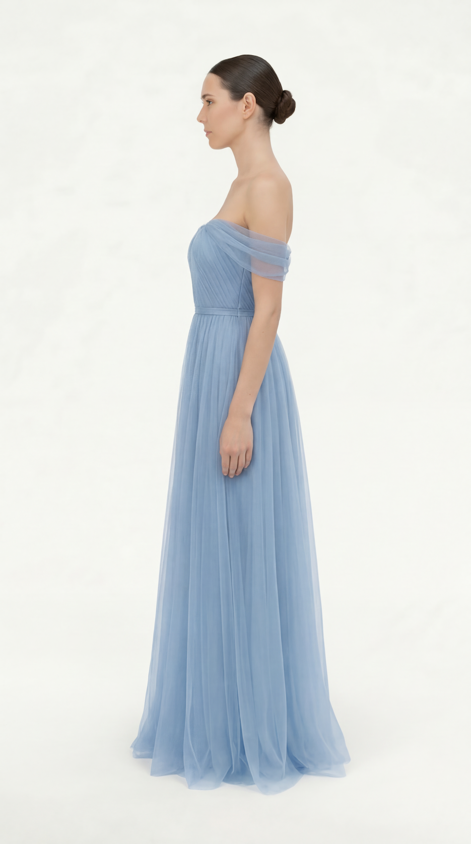 Crafted from delicate, lightweight tulle, this off-shoulder bridesmaid dress features a beautifully hand-pleated bodice with a romantic sweetheart neckline that enhances and supports the bust. Internal boning and lightly padded cups provide shape and structure, ensuring a secure, comfortable fit with no bra required. Fully lined for all-day wear, the bodice creates a smooth, sculpted silhouette that flatters every body shape.