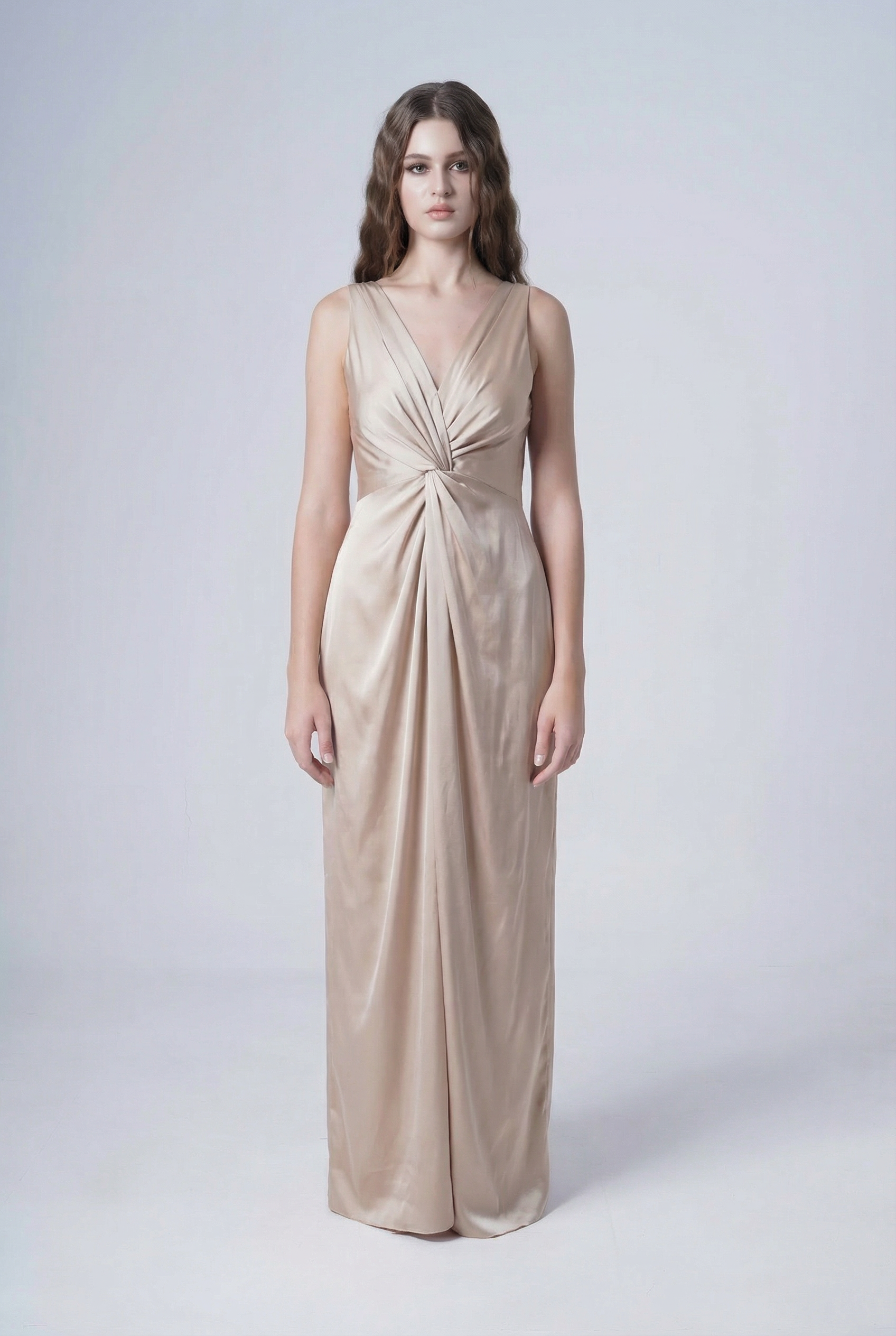 Carmen is a flattering satin bridesmaid dress, designed for modern bridal parties and a wide range of body types. Elegant, fluid, and size-inclusive, this gown features a twist-knot front with Grecian-inspired draping, creating a sculpted silhouette that allows for effortless movement.