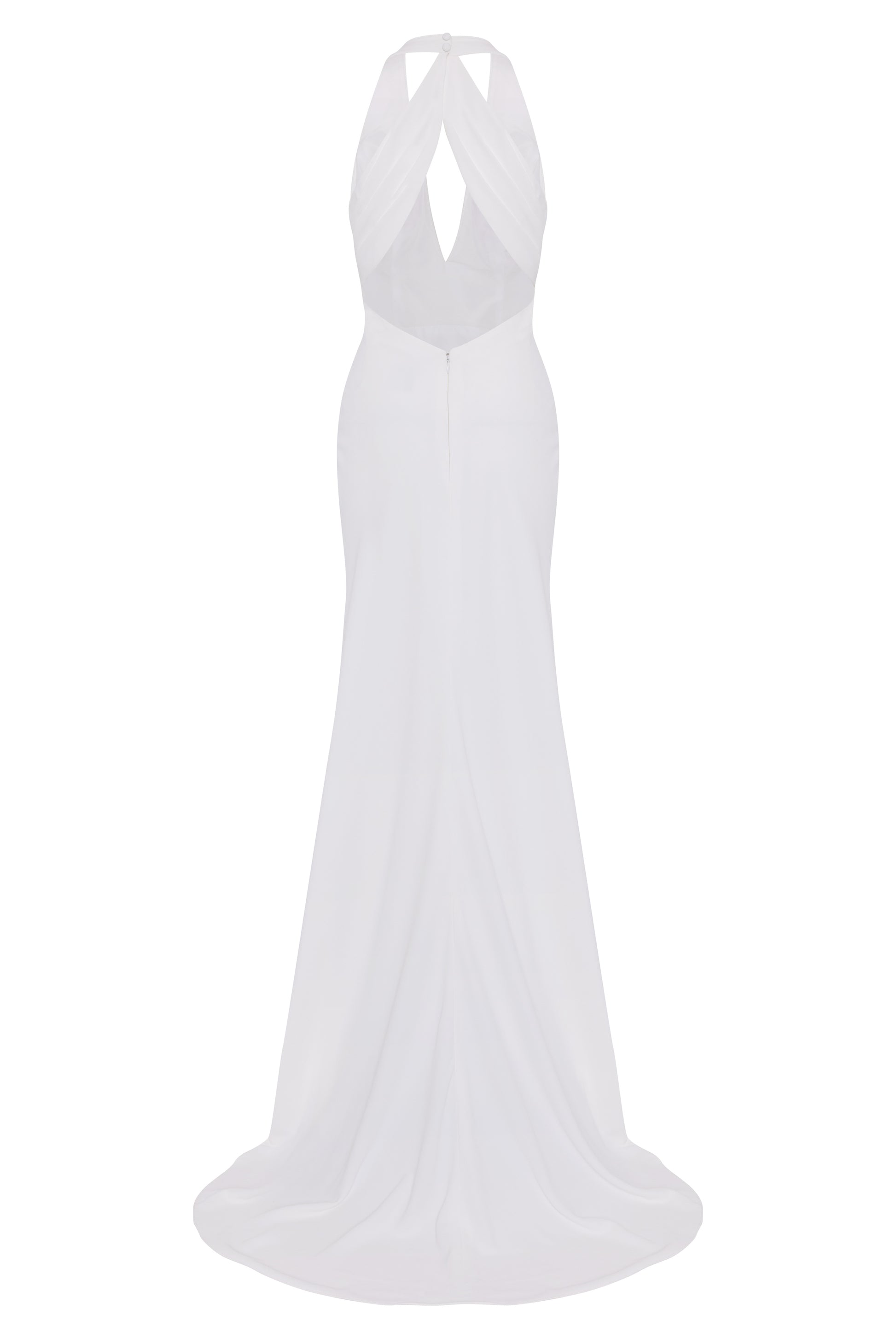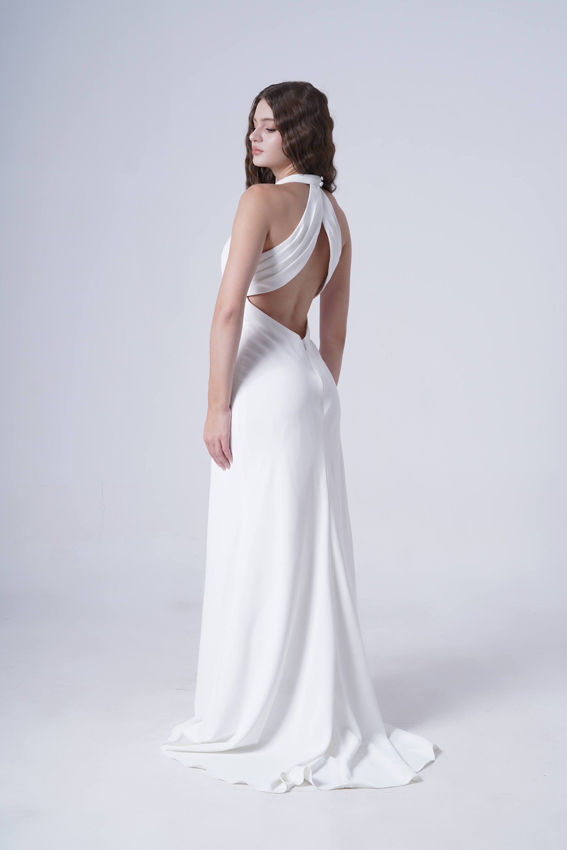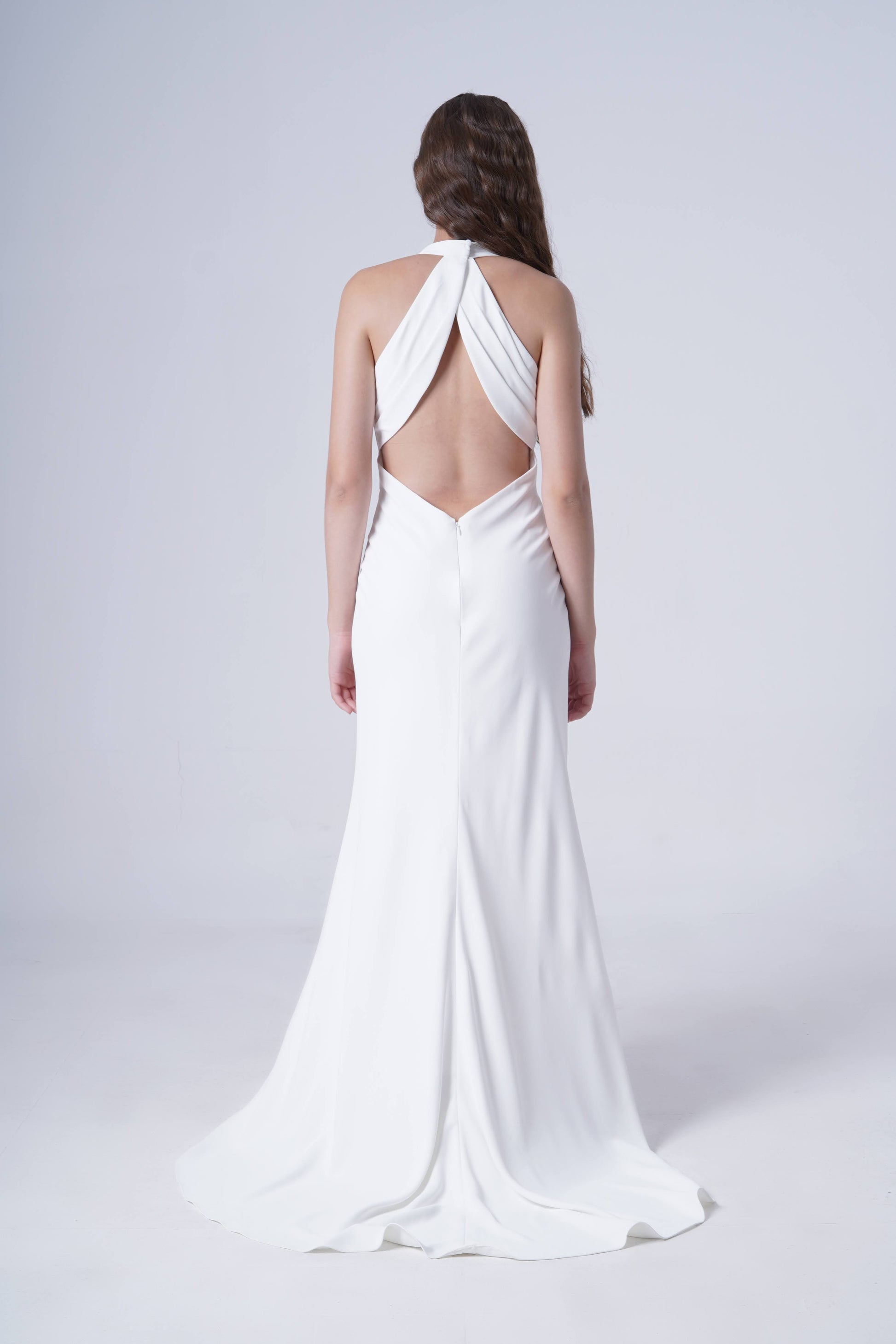 The halter neckline features a plunging front softened by delicate pleating that adds volume and movement without overwhelming the line. Lightly lined cups provide comfort and coverage, while pleated straps cross elegantly at the open back. Self-fabric covered buttons and a concealed back zip complete the seamless finish. The tailored skirt skims the body and flows into a subtle back train, combining effortless elegance with quiet drama.