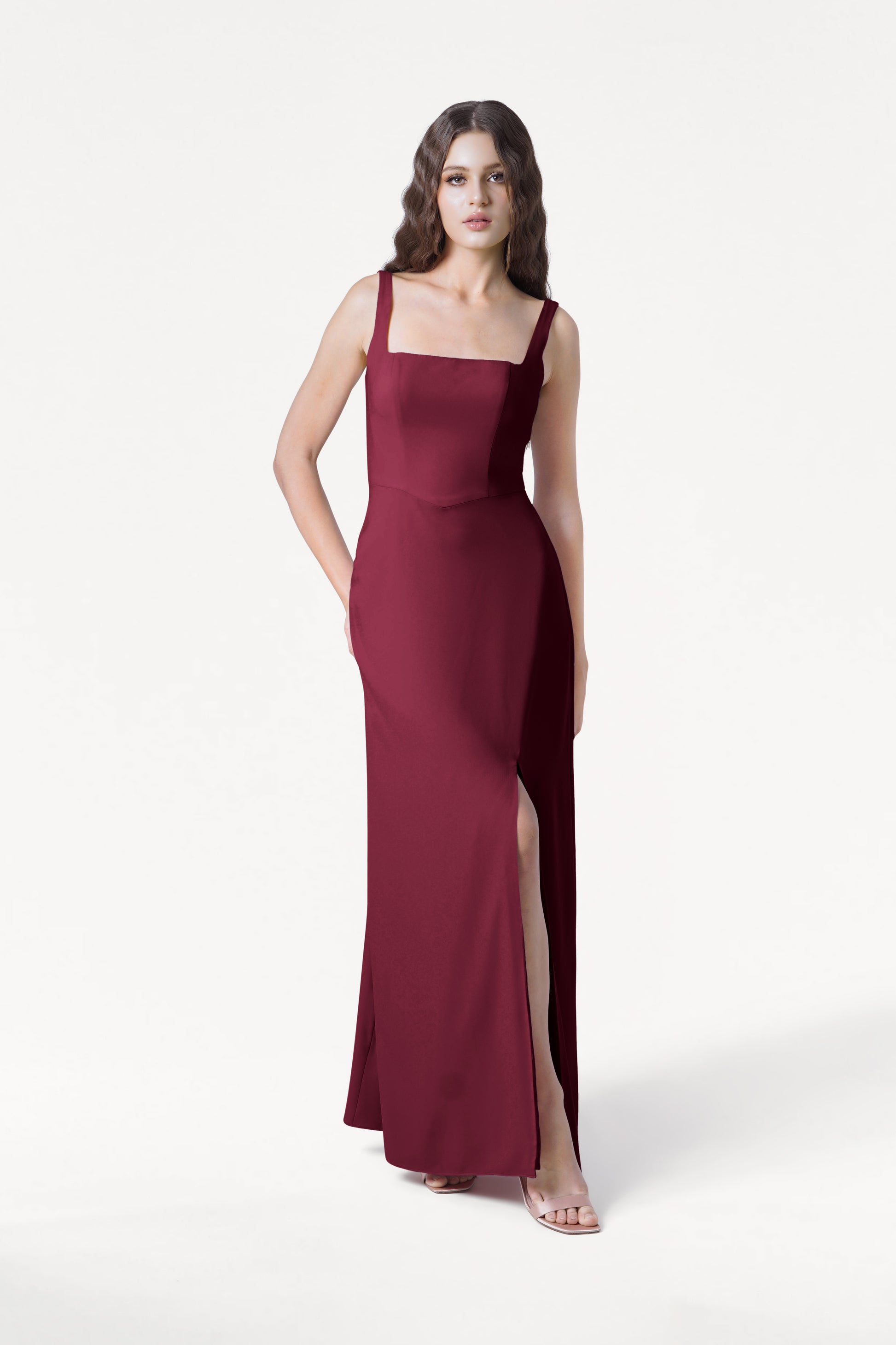 Helena is a modern moss crepe bridesmaid dress, designed for contemporary bridal parties seeking effortless sophistication. Elegant, structured, and thoughtfully size-inclusive, this fitted gown features a sleek square neckline and clean, timeless lines for a refined and modern look. Bra-friendly and designed with comfort in mind, Helena offers support without compromising on style.