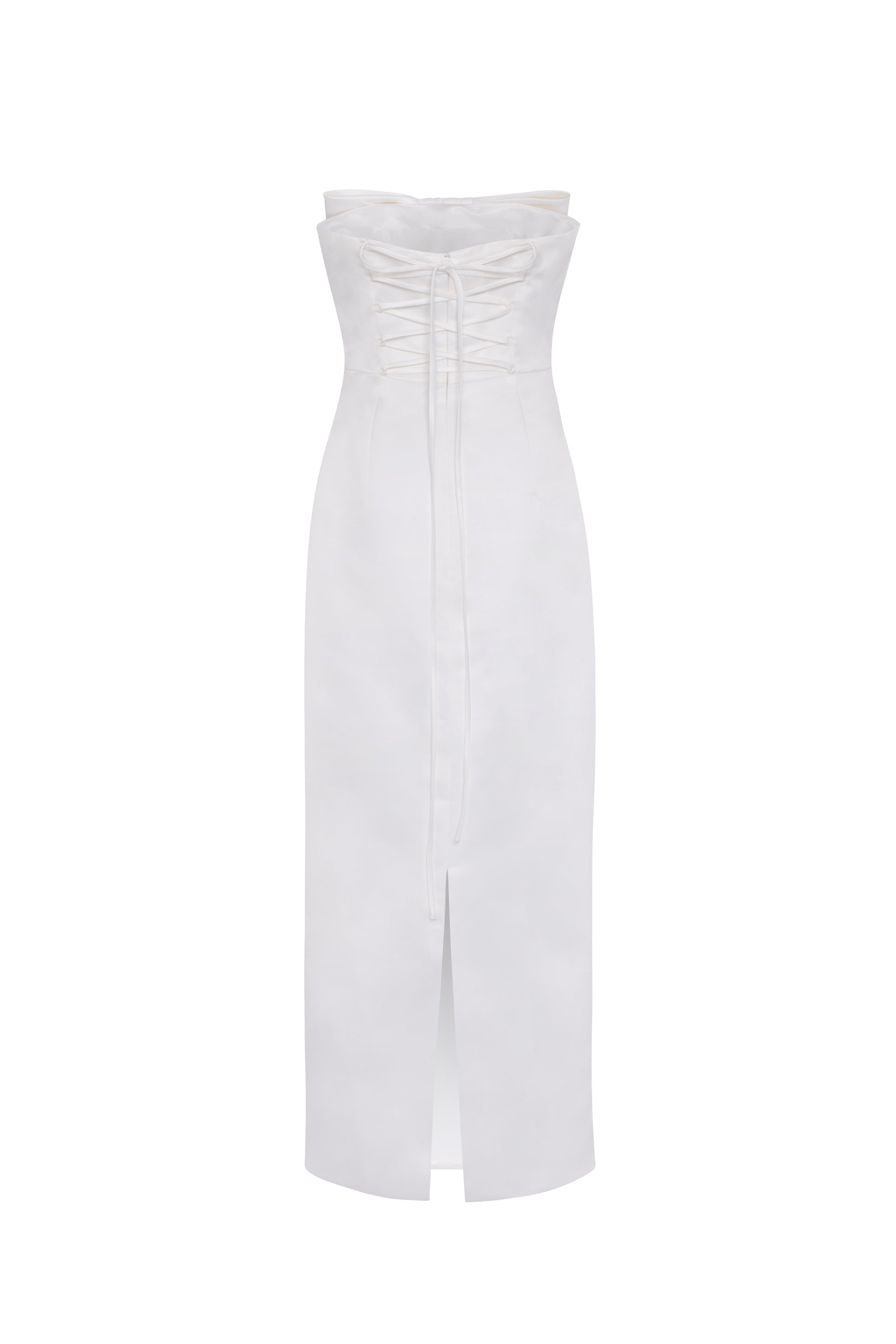The strapless bodice features tailored darts, internal boning, and cups for structure, support, and a flattering fit. A striking oversized bow at the front adds a fashion-forward focal point, while a lace-up corset back with discreet zip ensures a comfortable fit. The sleek column midi-length skirt elongates the body, finishing with a back slit for ease of movement, and can be easily altered into a mini dress for wear-again versatility.
