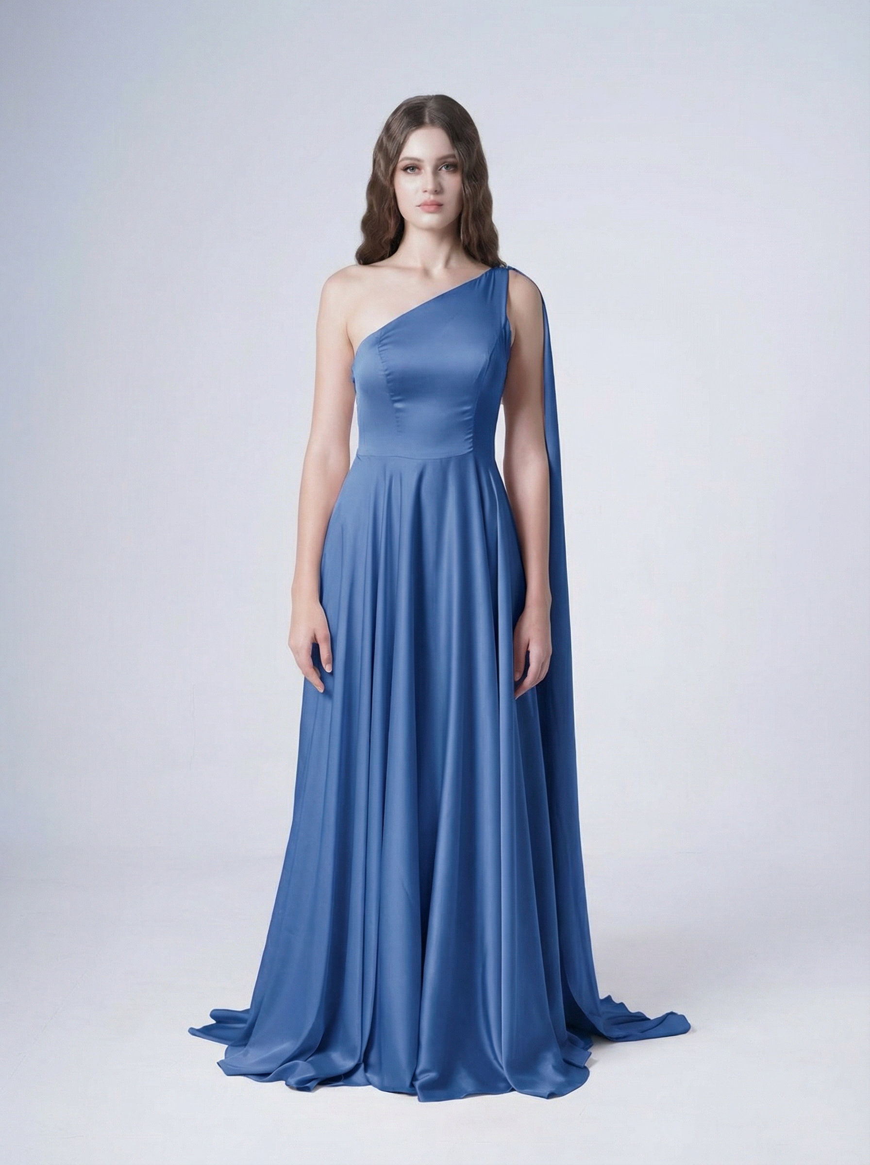Lyra is a modern satin bridesmaid dress, designed for contemporary bridal parties. Elegant, flowing, and size-inclusive, this one-shoulder gown features a removable satin scarf, creating a statement ceremony look that can easily transform into a refined evening style.