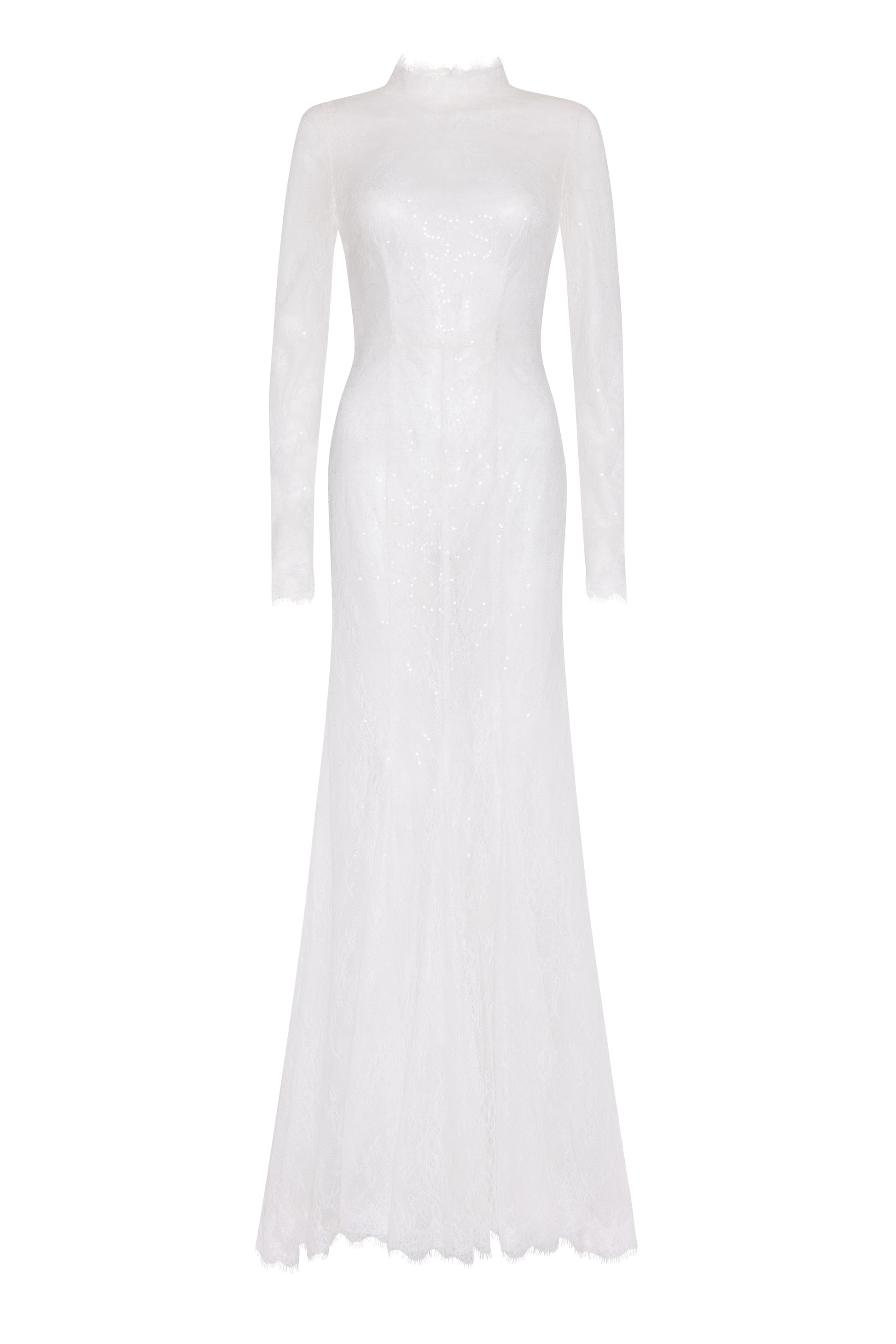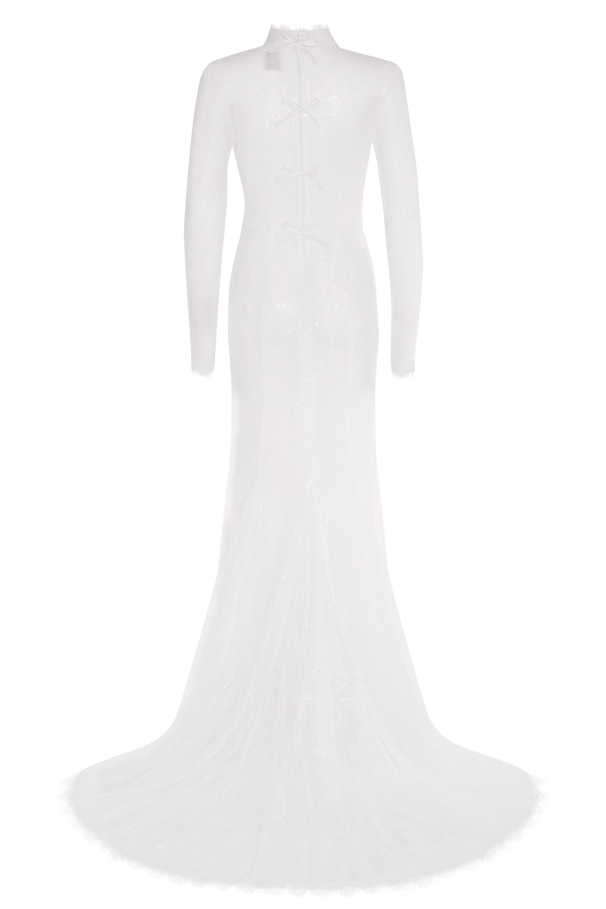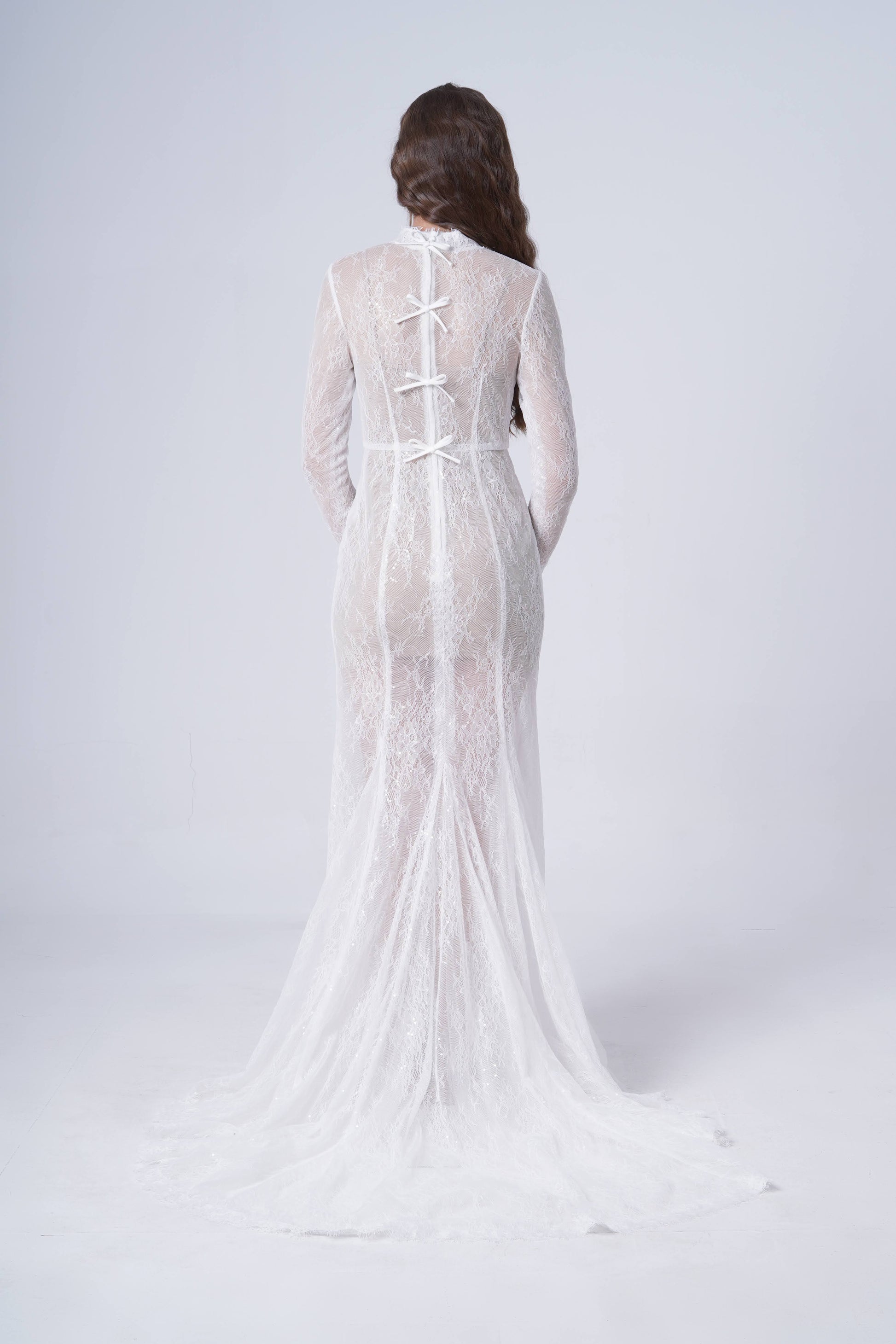 The gown features a high neckline, long sleeves, and eyelash lace edging for delicate, considered detail. Centre-back bows add a soft focal point, while the skirt flows into a dramatic lace train. A removable jersey cami lining ensures comfort and smooth fit, and for a contemporary twist, Nova can be styled over a nude bodysuit to create an editorial bridal look.