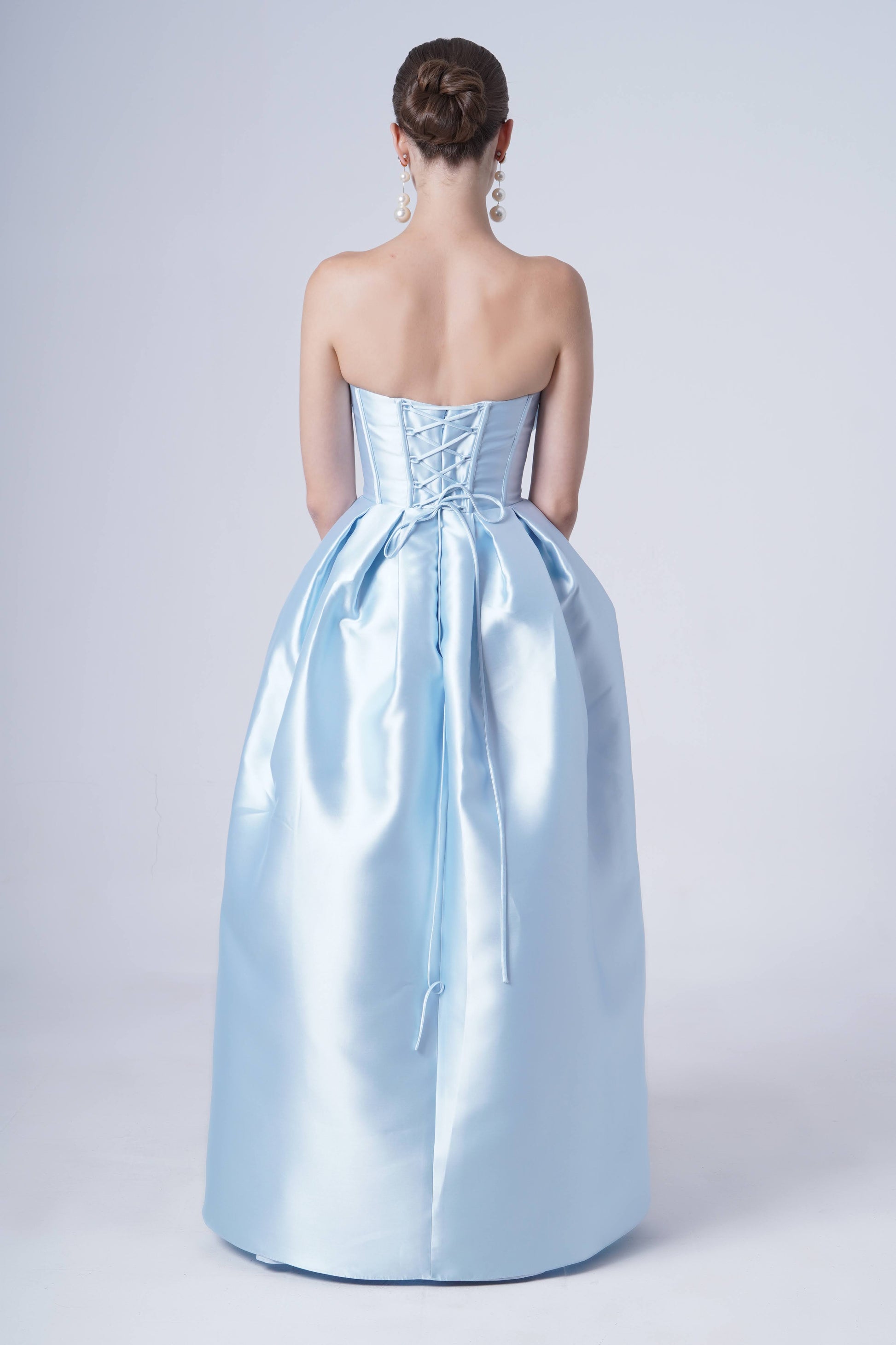Crafted from TH&TH’s new satin twill fabric, Ophelia combines subtle satin sheen with architectural shape for a sculptural yet soft silhouette. The strapless corset bodice provides support and structure, while hidden snaps allow the oversized bow to be positioned at the front for drama or the back for a refined finish. Fully lined for comfort, the skirt features structured box pleats forming a tulip-shaped silhouette, and hidden side seam pockets add a practical, modern touch.
