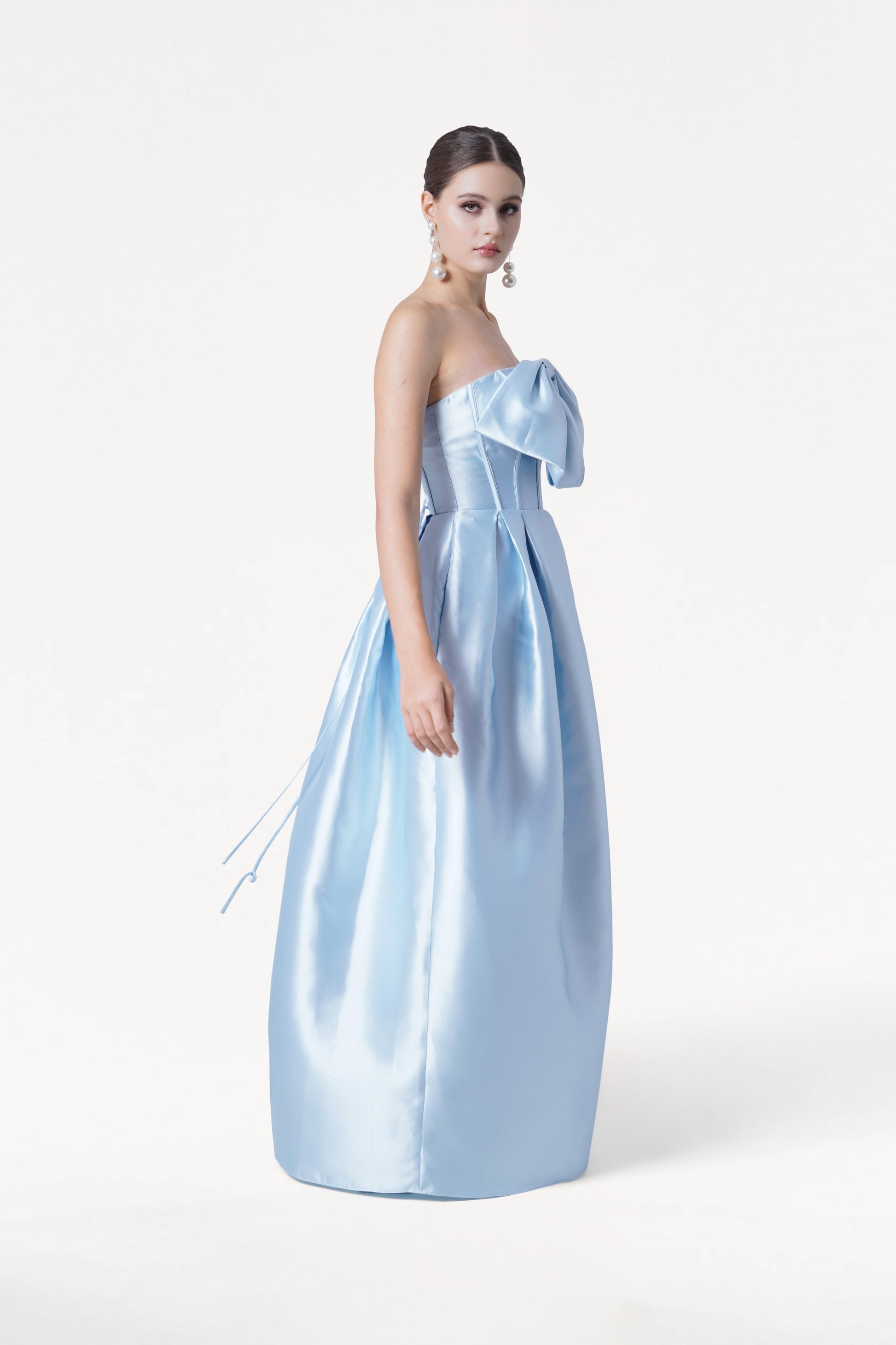 A removable bow can be positioned at the front bodice for statement drama or at the back waist for a more refined, modern finish, allowing each bridesmaid to customise their look. The structured box pleated skirt creates a softly sculptural silhouette with elegant volume, while hidden side-seam pockets add a practical, contemporary touch. The result is a gown that feels both fashion-forward and timeless, balancing clean lines with standout detailing.