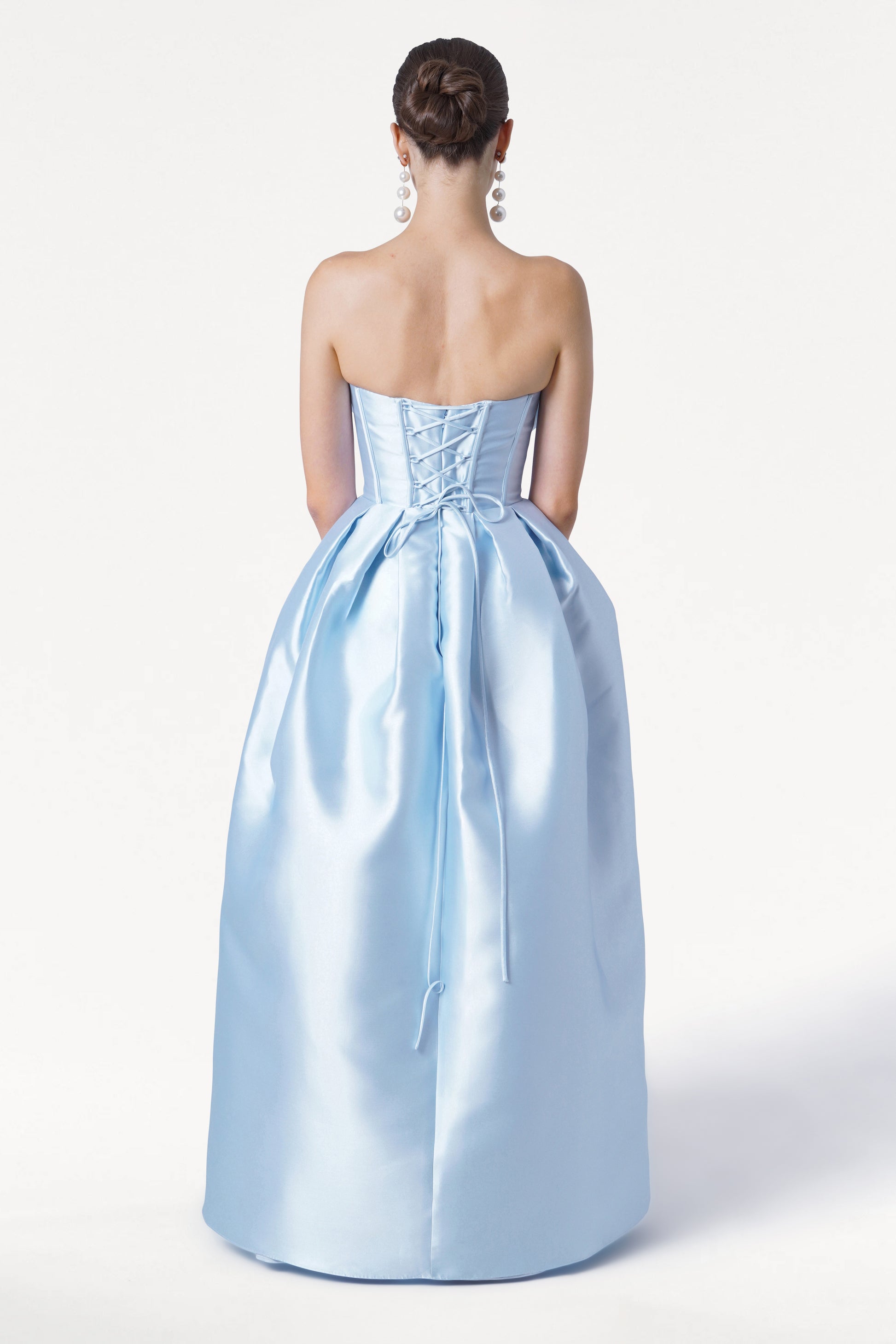 - Strapless, corseted bodice