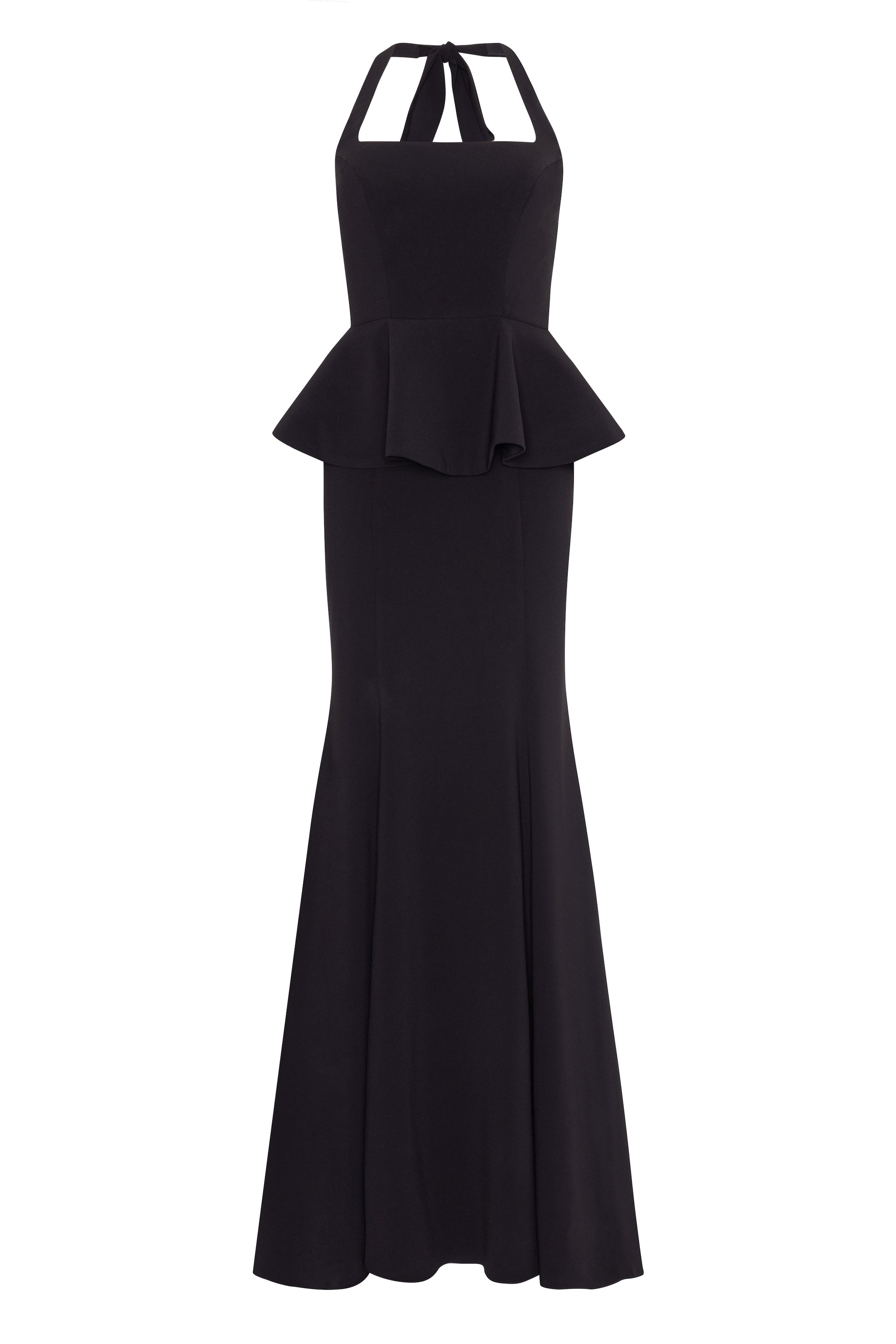 Peony is a modern moss crepe bridesmaid dress, designed for contemporary weddings. Elegant, sculptural, and size-inclusive, this fitted halter neck gown features a peplum waist, figure-hugging skirt, and dramatic back train, perfect for bridal parties seeking timeless style with a fashion-forward edge.
