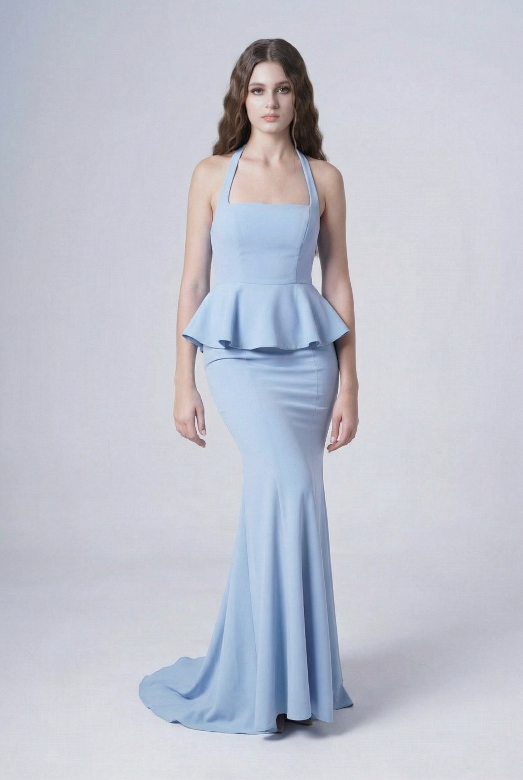 Peony is a modern moss crepe bridesmaid dress, designed for contemporary weddings. Elegant, sculptural, and size-inclusive, this fitted halter neck gown features a peplum waist, figure-hugging skirt, and dramatic back train, perfect for bridal parties seeking timeless style with a fashion-forward edge.