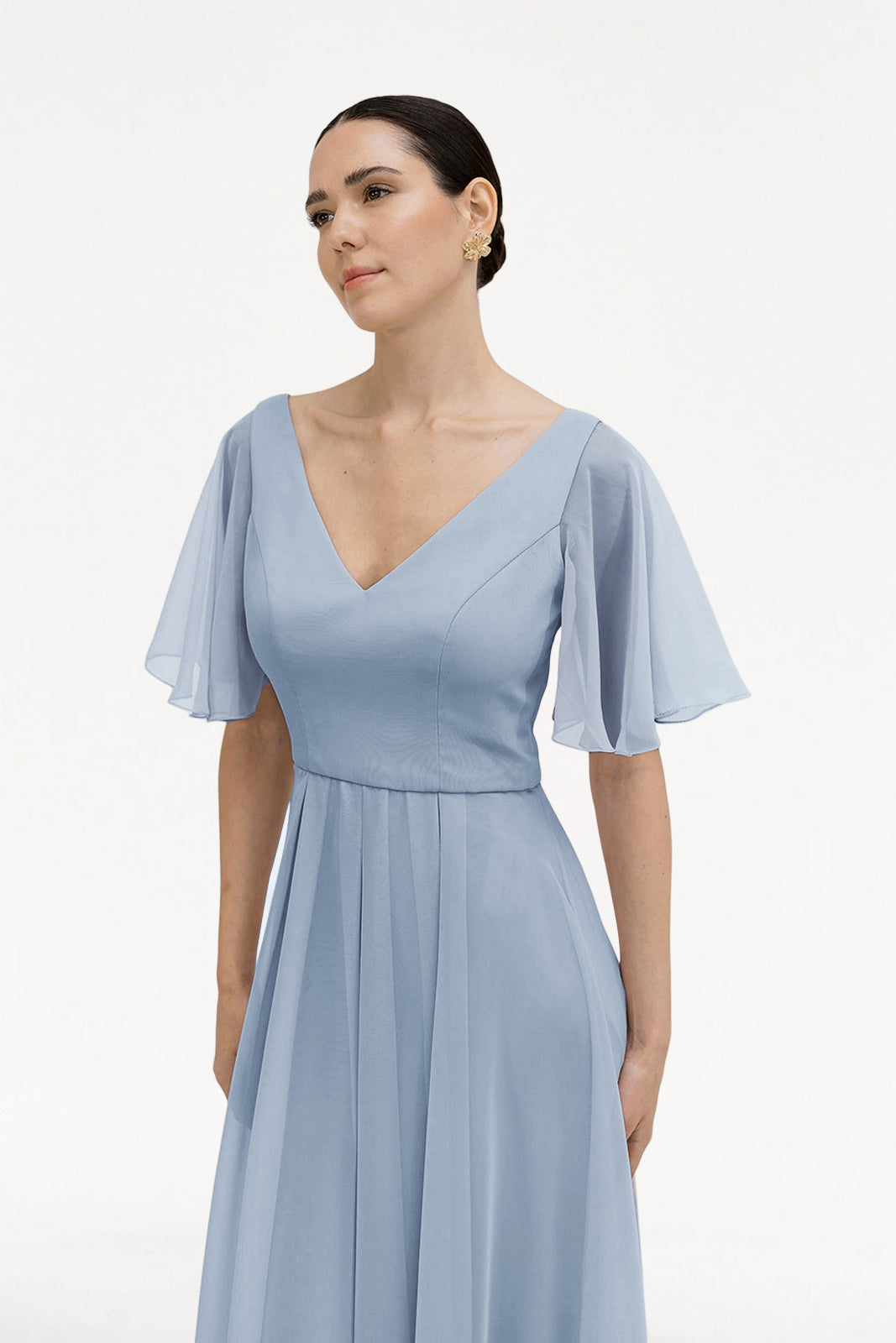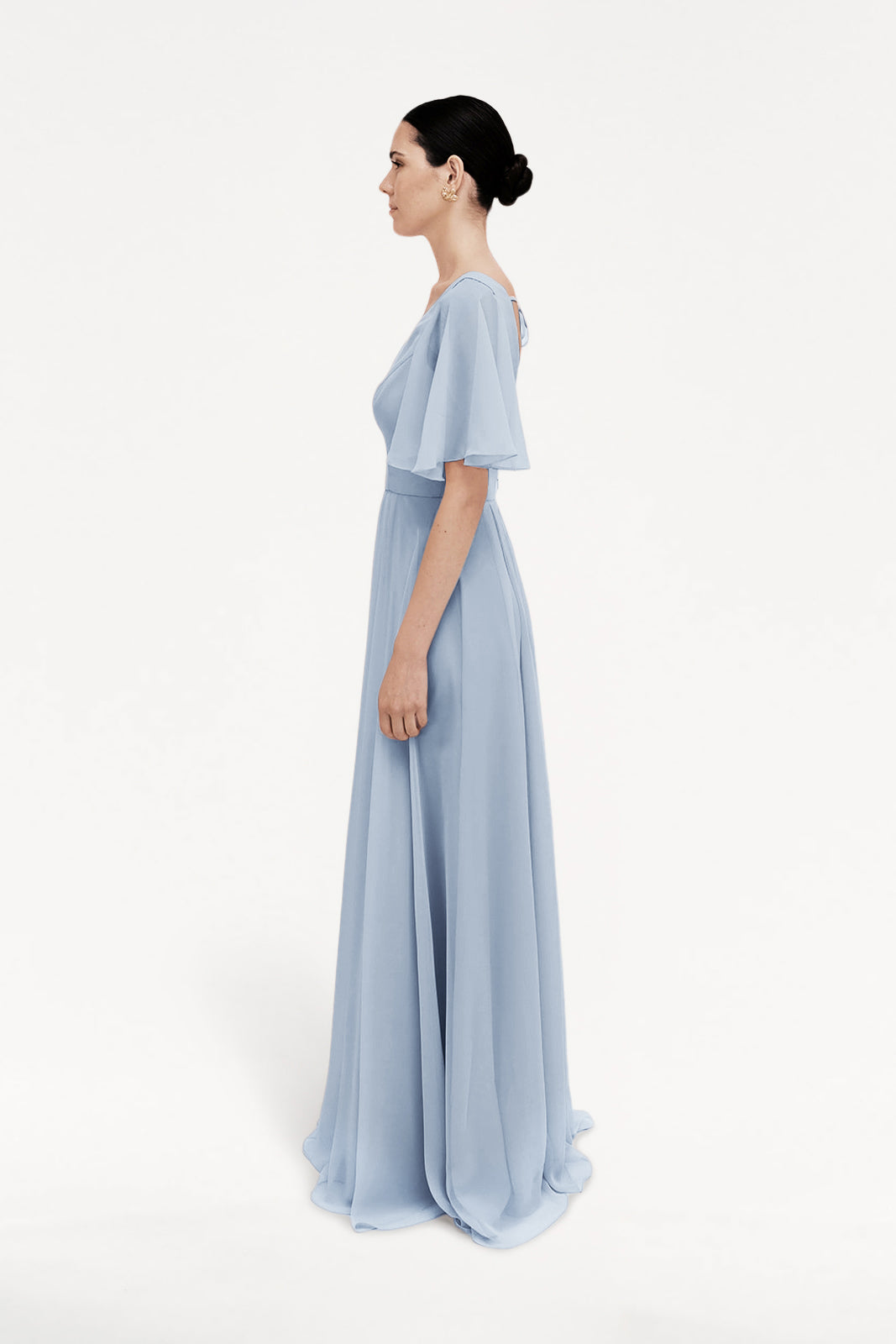 Soft, romantic, and effortlessly graceful, the Phoebe Gown is a timeless choice for any bridal party. Crafted from our signature light-as-air chiffon, this full-length bridesmaid dress features a flattering V-neckline and delicate angel sleeves that drape gently over the shoulders, bringing an ethereal touch to the silhouette.