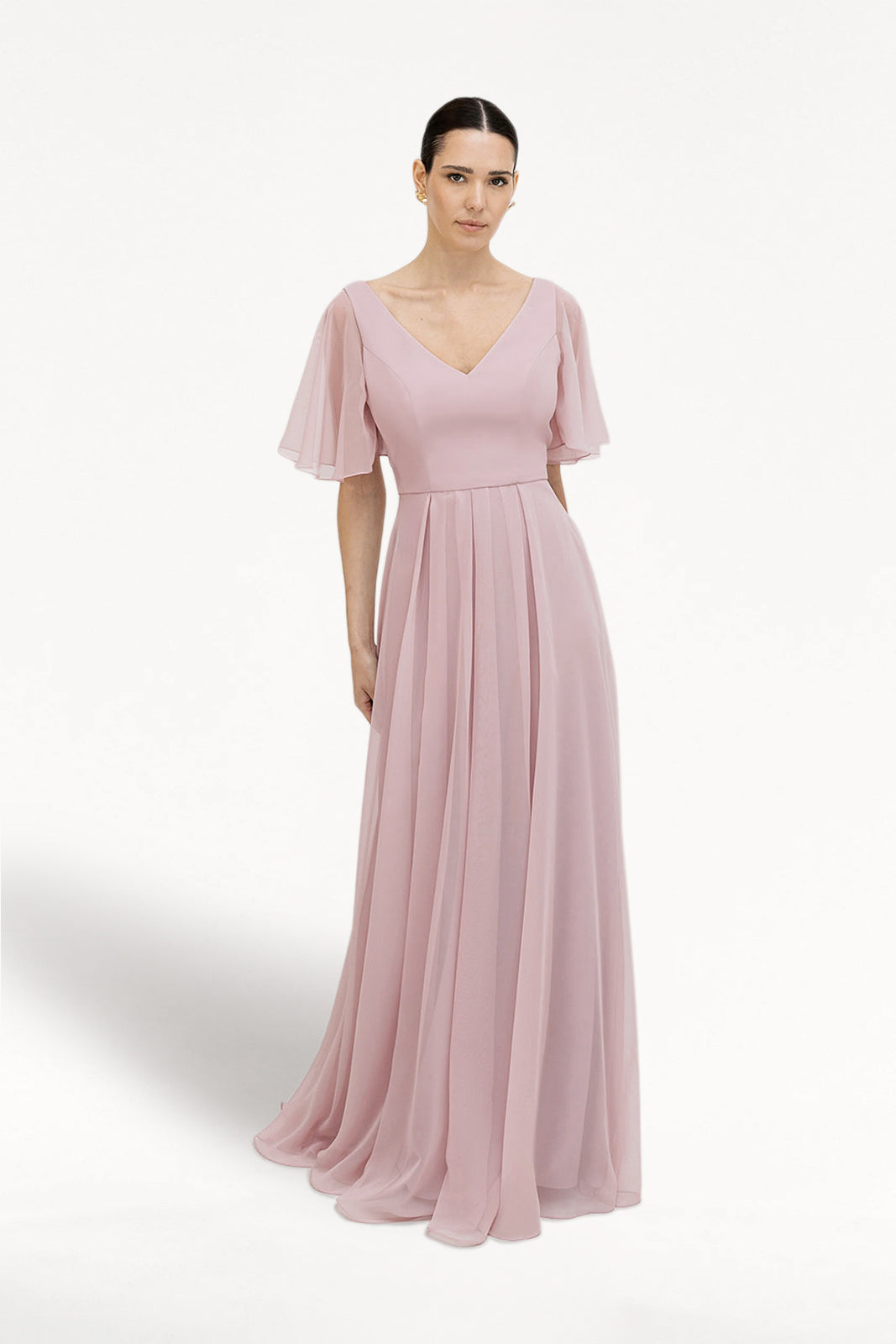 Soft, romantic, and effortlessly graceful, the Phoebe Gown is a timeless choice for any bridal party. Crafted from our signature light-as-air chiffon, this full-length bridesmaid dress features a flattering V-neckline and delicate angel sleeves that drape gently over the shoulders, bringing an ethereal touch to the silhouette.