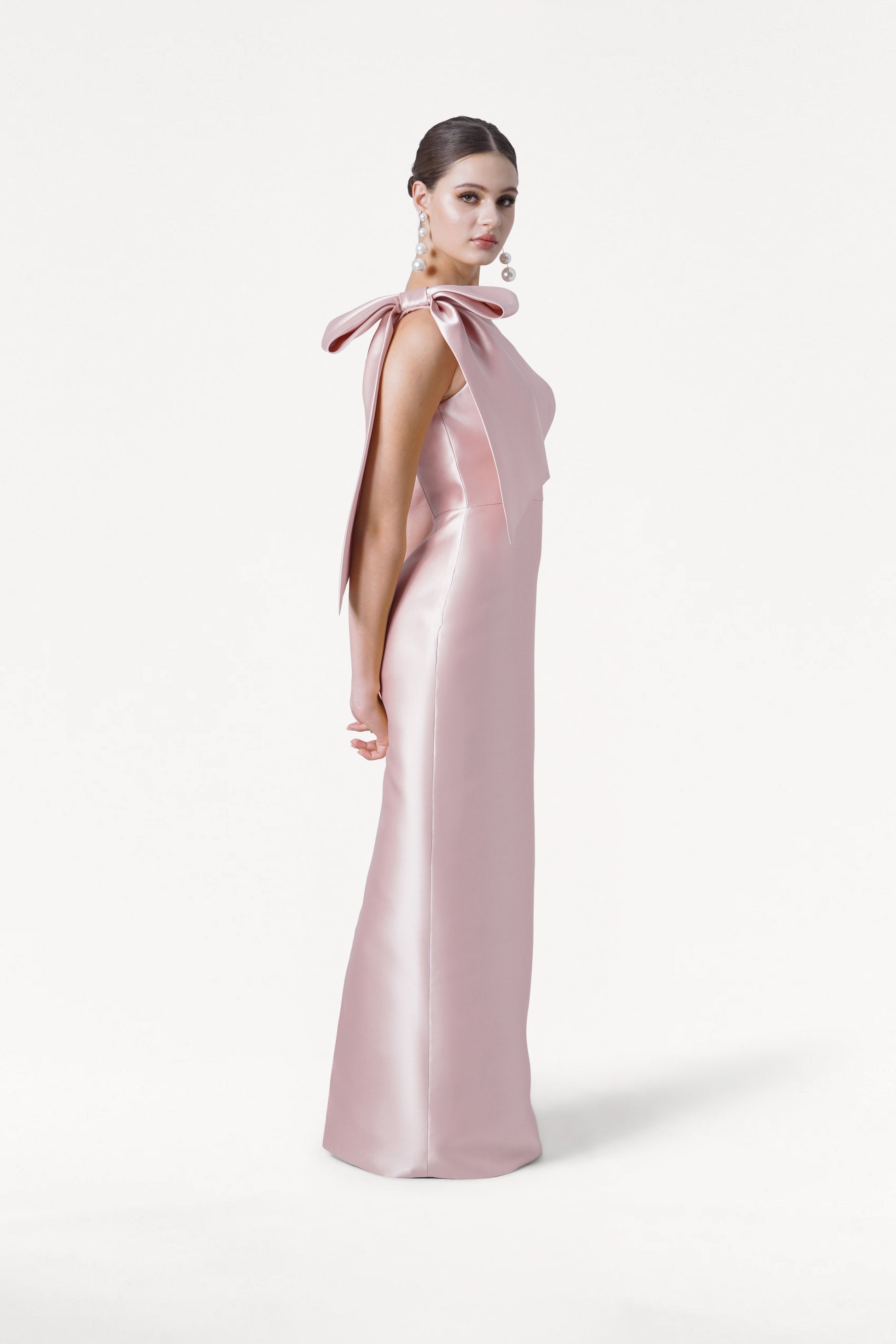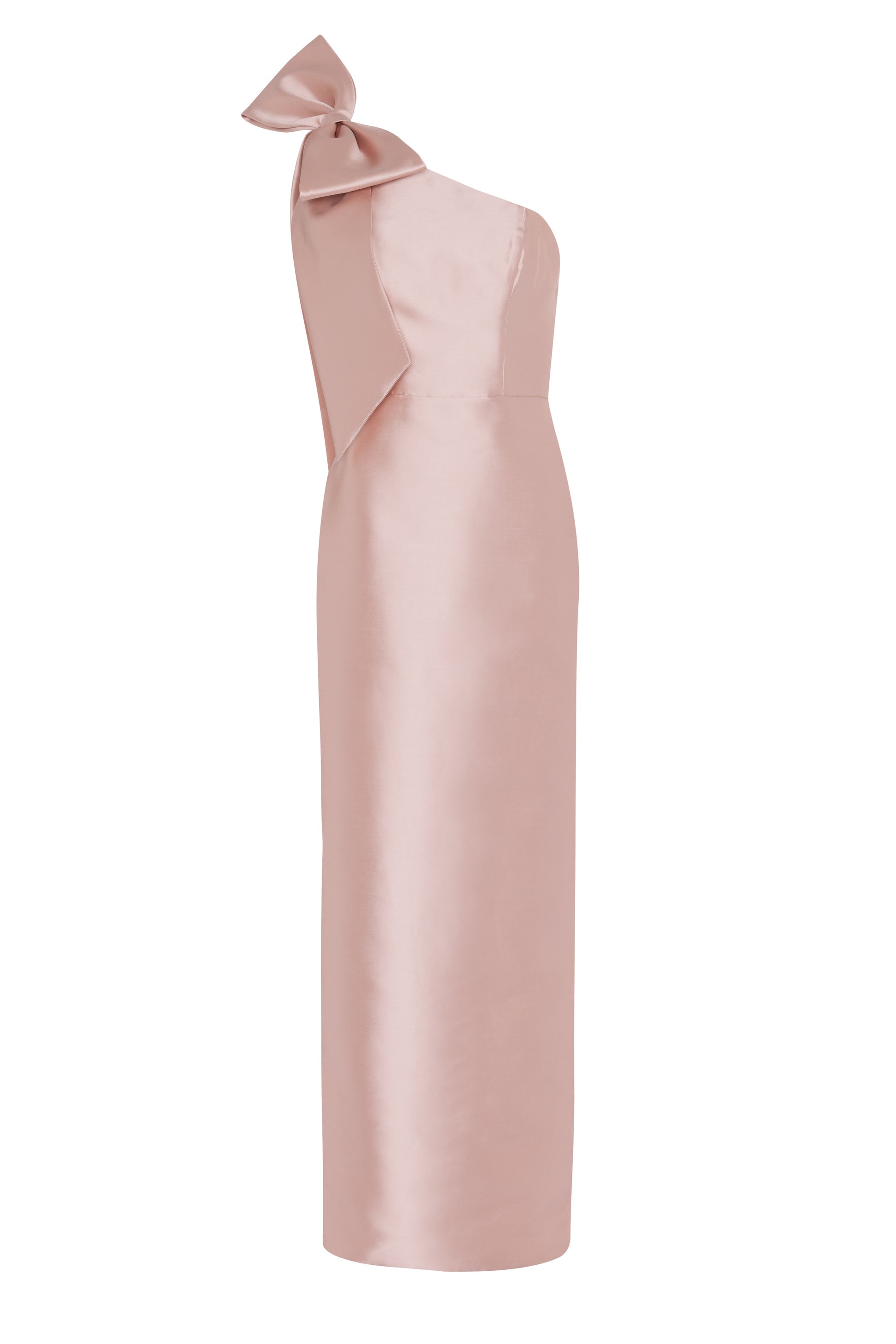 Cut from TH&TH’s signature satin twill, Ritz offers a soft yet structured hand feel with a subtle satin sheen that elevates the entire look. The one-shoulder neckline is finished with an oversized statement bow that adds dramatic movement and modern romance, making it perfect for formal and black-tie celebrations. The fitted bodice flows seamlessly into a sleek column skirt that elongates the body, while a discreet back skirt slit allows for effortless movement without compromising the gown’s clean, elegant line.