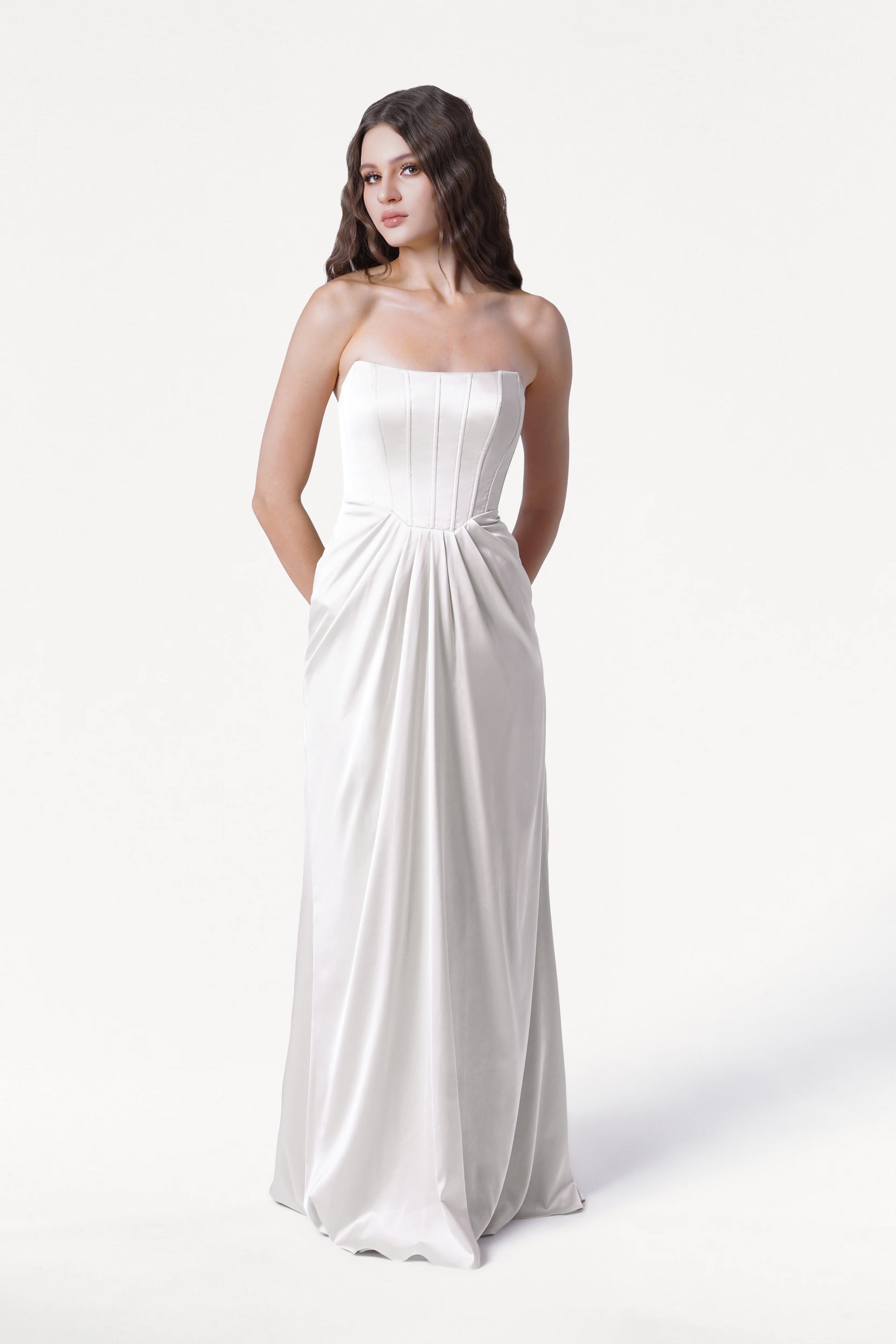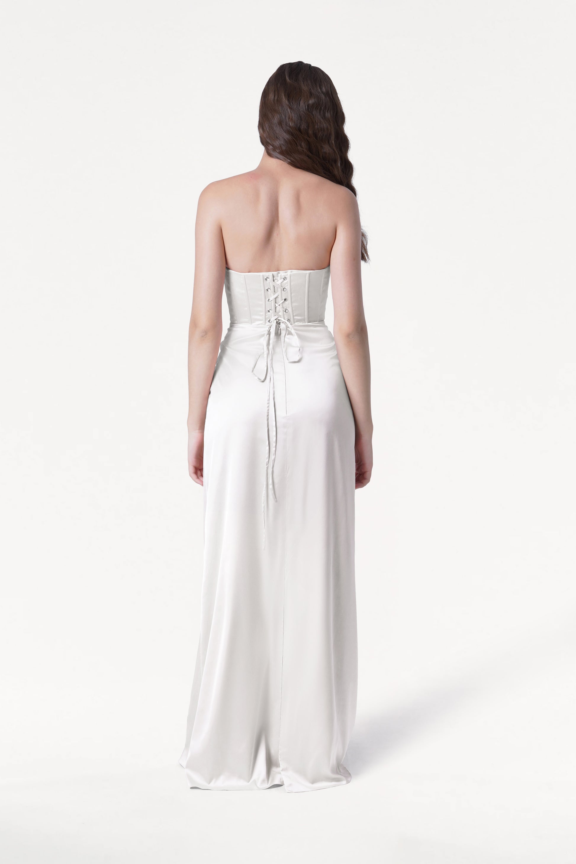 The Selena Dress is a sculptural satin bridesmaid dress designed to flatter every curve. Selena has a fully lined corset bodice that features built‑in cups, internal structure, and a lace‑up back with self‑fabric ties for a secure, personalised fit. The waist is finished with beautifully draped pleats that hug the body, creating a cinched, elegant silhouette that flows into soft, drapey satin for effortless movement.