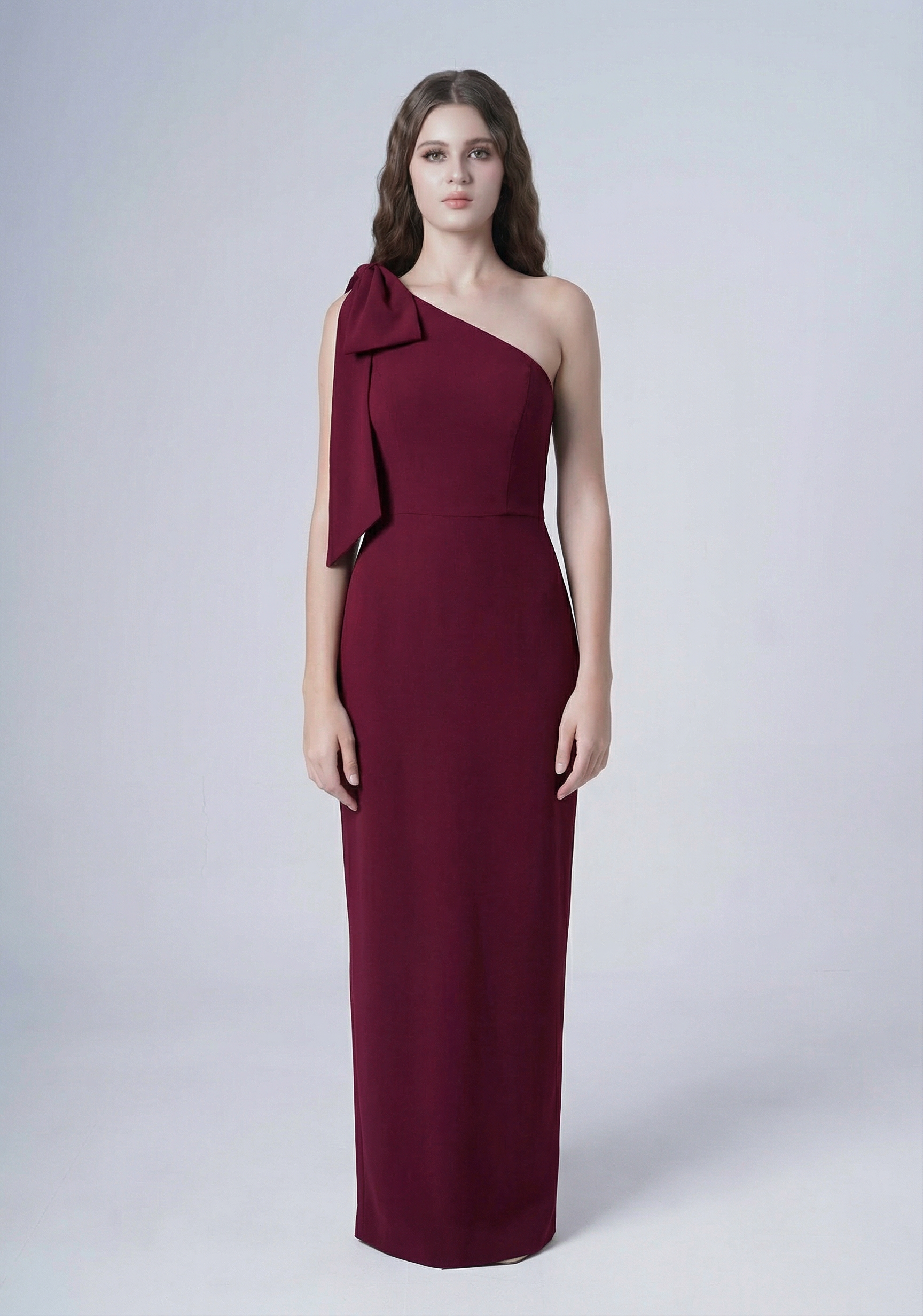 Valentina is a modern moss crepe bridesmaid dress, designed for contemporary bridal parties. Elegant, structured, and size-inclusive, this one-shoulder gown features a draped bow with long flowing tails, creating a fashion-forward yet effortlessly refined look.